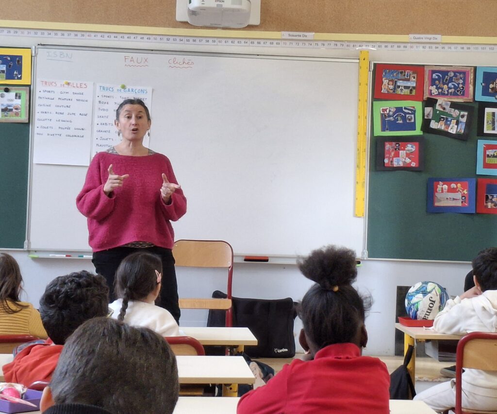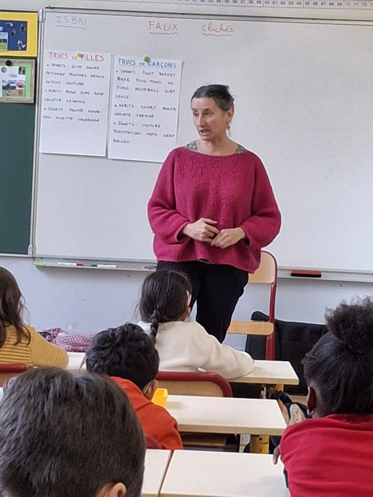La matinée a débuté par un échange avec les élèves autour des clichés souvent associés aux filles et aux garçons. Ensemble, ils ont ensuite réfléchi à tout ce que filles et garçons peuvent faire de la même manière.
