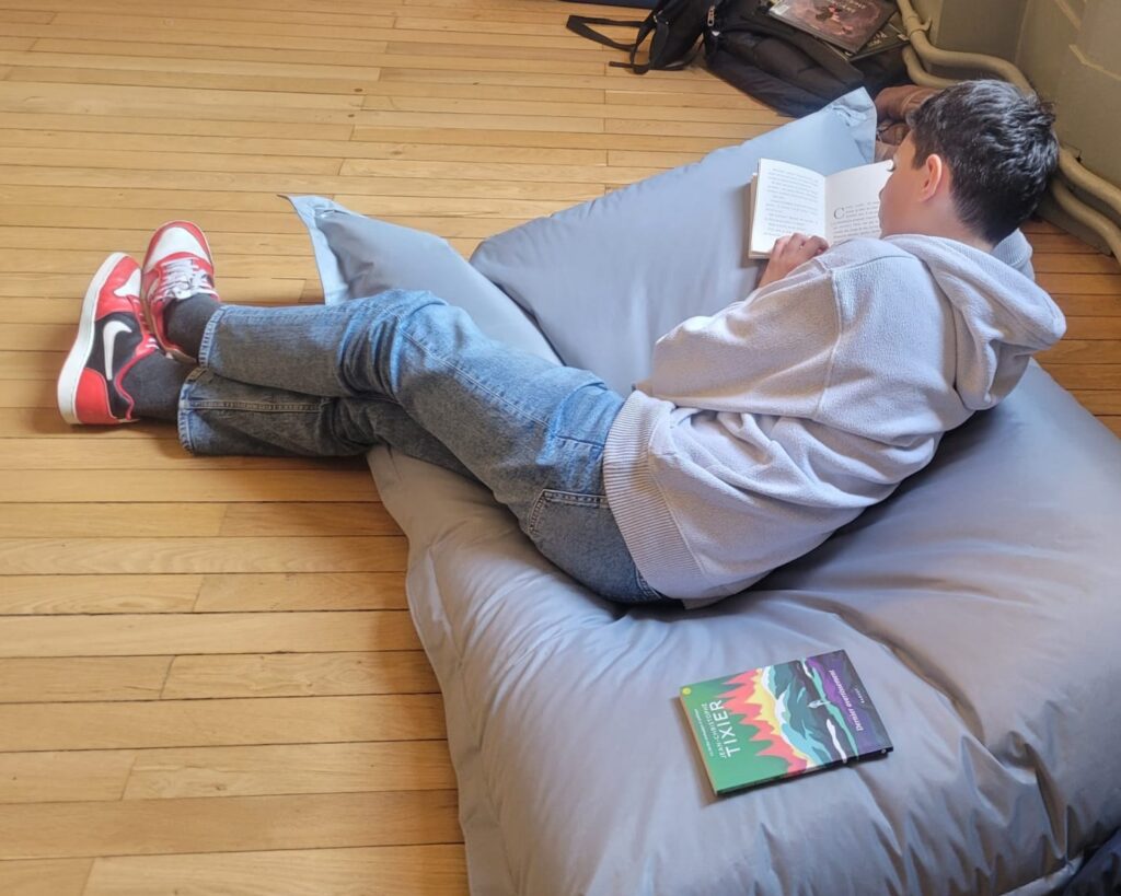 Outre les séances de lecture, certains enfants ont également profité de nos grands poufs pour s’installer confortablement et plonger dans un livre de leur choix. Un moment de calme et de sérénité, en contraste avec l’animation du rez-de-chaussée, où se déroulaient les autres activités du festival.